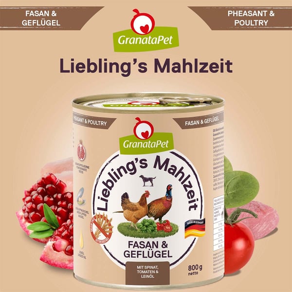 GranataPet Liebling's Mahlzeit Fasan und Geflügel ist ideal für Senioren und erwachsene Hunde geeignet. Die spezielle Zusammensetzung dieses Nassfutters ist perfekt auf die Bedürfnisse älterer Hunde abgestimmt und liefert alle wichtigen Nährstoffe. Viel hochwertiges Eiweiß aus Herz deckt den Energiebedarf aktiver Hunde und sorgt für eine ausgewogene Ernährung.