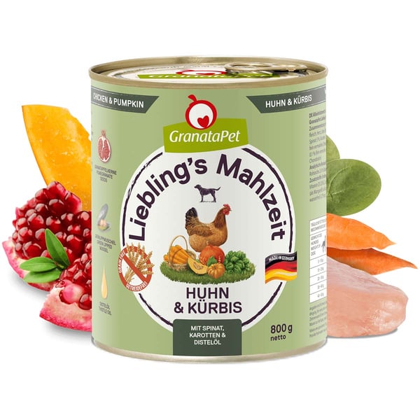 GranataPet Nassfutter Liebling’s Mahlzeit Huhn & Kürbis hat einen hohen Fleischanteil.