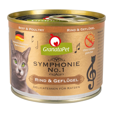 GranataPet Symphonie No. 1 Rind & Geflügel 6x200g kommt ohne die Zugabe von Zucker, künstlichen Aromastoffen, Soja und Konservierungsmitteln aus. Zudem ist das Futter getreidefrei und glutenfrei, was es besonders für Katzen mit Unverträglichkeiten geeignet macht. So kannst du sicher sein, dass deine Katze nur das Beste erhält.