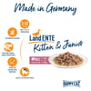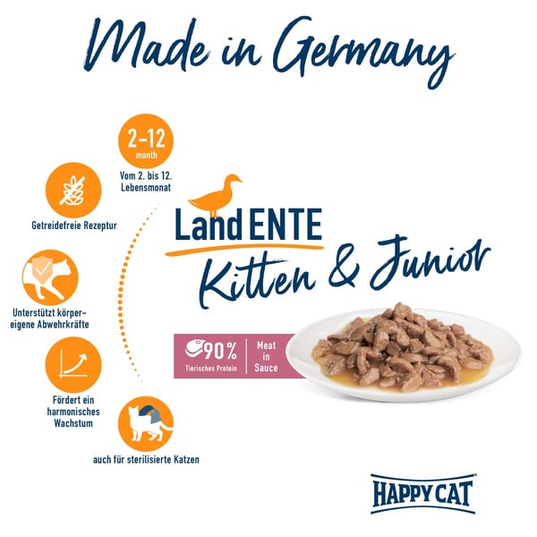 Happy Cat Meat in Sauce Kitten & Junior mit Land-Ente wird mit hochwertigem Fleisch sorgfältig zubereitet. Die leicht verdauliche und getreidefreie Rezeptur mit Geflügel an leckerer Soße ist genau auf die Bedürfnisse kleiner Katzenkinder abgestimmt. Auf Basis des Happy Cat Natural Life Concept® haben die Ernährungsexperten eine spezielle Vitalitätsformel entwickelt, die auf natürliche Art und Weise die fünf wichtigsten Bedürfnisse einer Katze abdeckt. Ernährungsphysiologisch bestätigt sorgt es für eine geregelte Verdauung, stärkt das Immunsystem, unterstützt den Harntrakt, fördert die Herzgesundheit und ist gut für Haut & Fell.