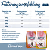 Empfohlene Tagesfuttermenge bei ausschließlicher Fütterung: Alter des Kätzchens 2 Monate - mittlere Rassen (bis 5 kg Adultgewicht) 200 g pro Tag, große Rassen (6-8 kg Adultgewicht) 250 g pro Tag; Alter 3-4 Monate - mittlere Rassen (bis 5 kg Adultgewicht) 260 g pro Tag, große Rassen (6-8 kg Adultgewicht) 340 g pro Tag; Alter 5-9 Monate - mittlere Rassen (bis 5 kg Adultgewicht) 330 g pro Tag, große Rassen (6-8 kg Adultgewicht) 470 g pro Tag; Alter 10-12 Monate - mittlere Rassen (bis 5 kg Adultgewicht) 350 g pro Tag, große Rassen (6-8 kg Adultgewicht) 490 g pro Tag; 1 Pouch entspricht ca. 20g Trockenfutter. Der individuelle Bedarf ist abhängig von Alter, Rasse und Aktivität. Ständig frisches Wasser in einem vom Futternapf deutlich entfernt stehenden Napf anbieten. Bitte zimmerwarm füttern. Kitten regelmäßig wiegen und die Gewichtsentwicklung dokumentieren. Die Tagesfuttermenge auf mehrere Mahlzeiten aufteilen. Ab dem 12. Monat auf ein geeignetes Happy Cat Adult Futter umstellen.