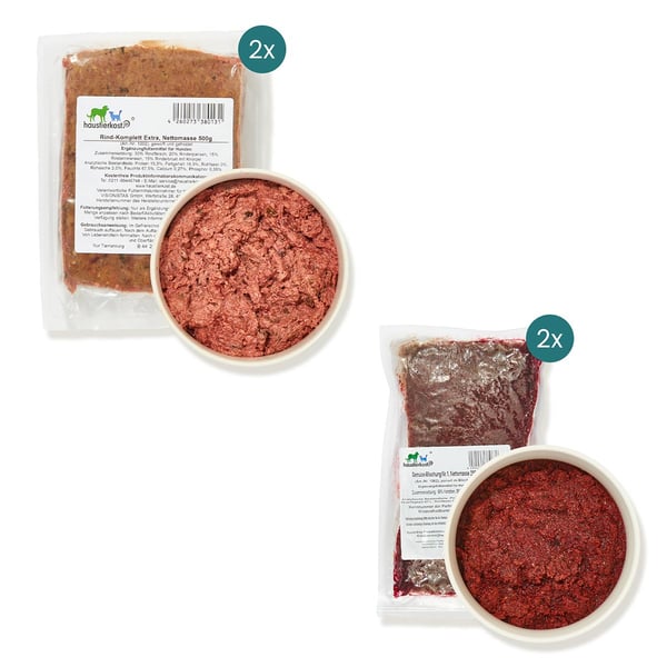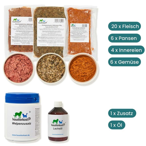 Das Haustierkost Welpen Starterset bietet deinem Vierbeiner einen optimalen Einstieg in die BARF-Ernährung. Mit fein gewolftem Fleisch von Rind oder Geflügel minimierst du das Risiko des Verschluckens und bereitest deinen Welpen auf feste Nahrung vor. Die enthaltenen Obst- und Gemüsemischungen bieten zusätzliche Nährstoffe und sorgen für eine ausgewogene Ernährung.