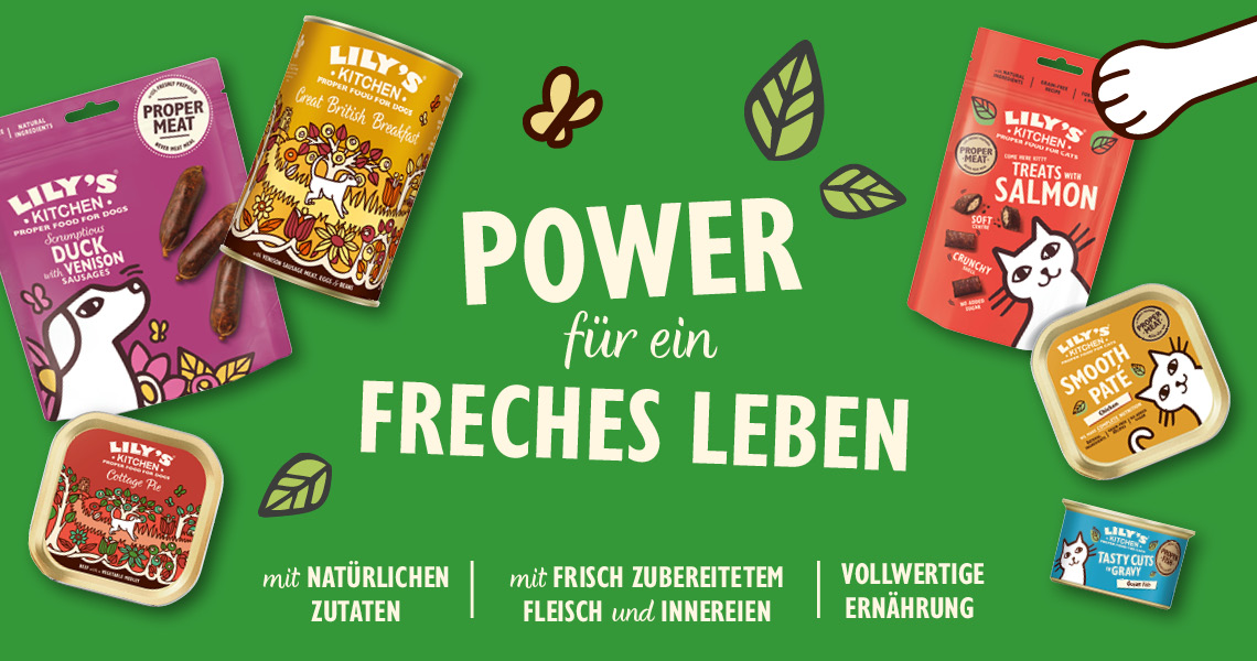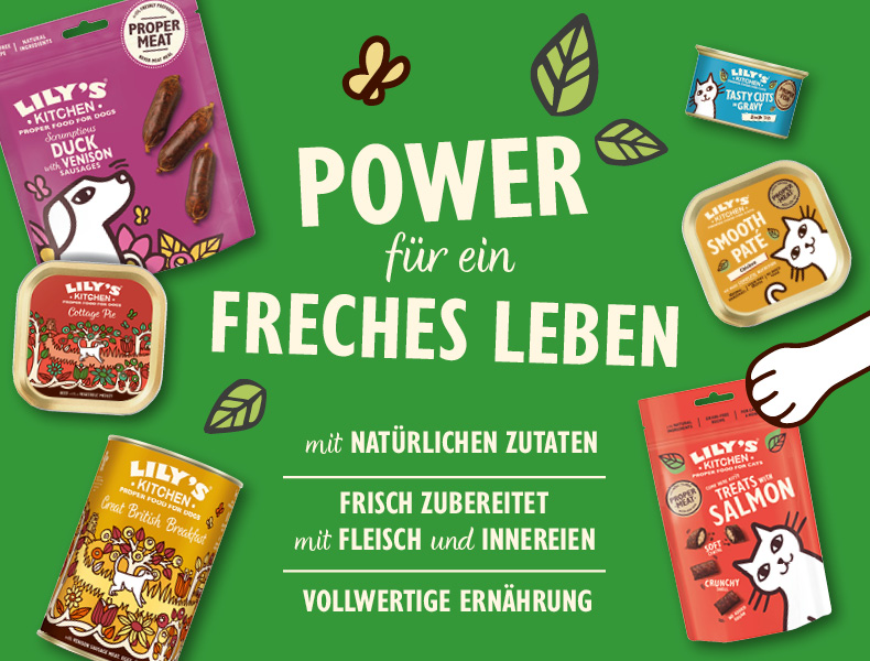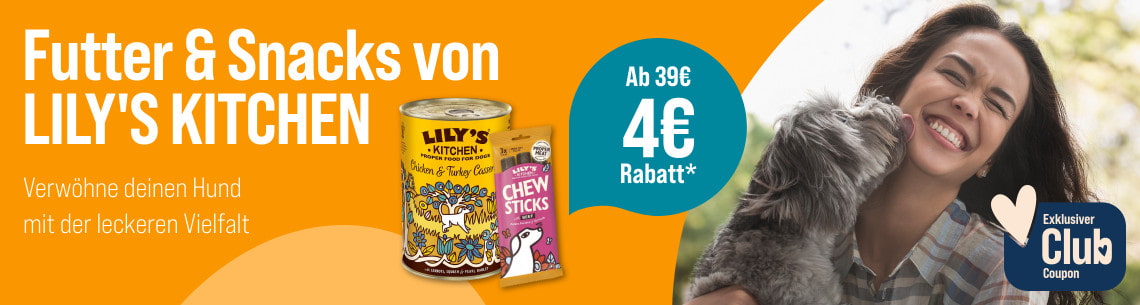*Gültig vom 14.07.2025 bis 10.08.2025 nur für ZooRoyal Club Mitglieder. 4 € Rabatt ab 39 € auf Lily's Kitchen Futter & Snacks. Gilt nur auf ausgewählte Produkte dieser Aktionsseite. Gilt nur im ZooRoyal Online-Shop und nicht in den ZooRoyal Fachmärkten.