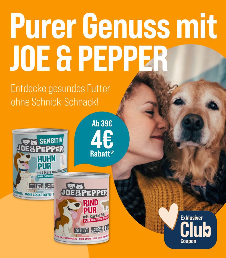 *Gültig vom 21.04.2025 bis 18.05.2025 nur für ZooRoyal Club Mitglieder. Spare 4 € ab 39 € auf JOE & PEPPER Hundenassfutter. Das Angebot gilt nur auf ausgewählte Produkte auf unserer Aktionsseite. Nur solange der Vorrat reicht. Gilt nur im ZooRoyal Online-Shop und nicht in den ZooRoyal Fachmärkten.