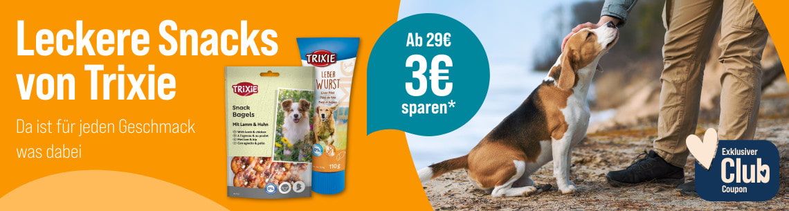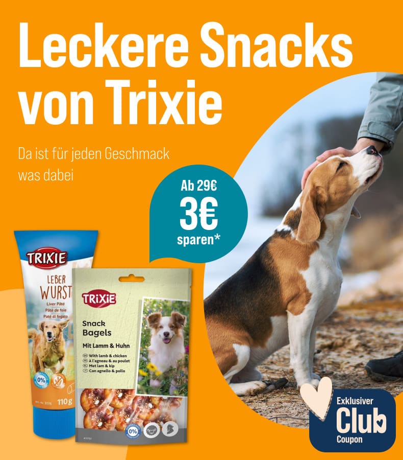 *Gültig vom 06.10.2025 bis 02.11.2025 nur für ZooRoyal Club Mitglieder. 3 € Rabatt ab 29 € auf Snacks von Trixie. Gilt nur auf ausgewählte Produkte dieser Aktionsseite. Gilt nur im ZooRoyal Online-Shop und nicht in den ZooRoyal Fachmärkten.