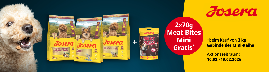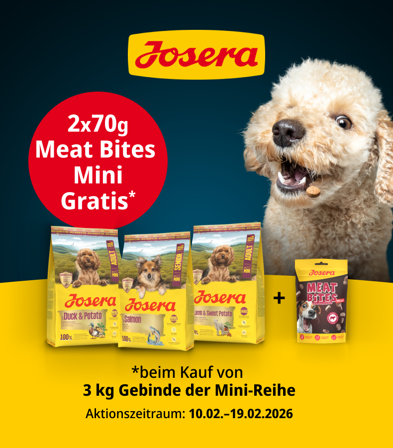 *Gültig vom 10.02.2026 bis 19.02.2026. Gratis 2x70 g Josera Meat Bites Mini Beef beim Kauf von Josera Mini Exklusiv (3 Kg) mit dem Code Jos-Beefs. Das Angebot gilt nur auf ausgewählte Produkte auf unserer Aktionsseite. Nur solange der Vorrat reicht. Nur ein Gutscheincode pro Bestellung einlösbar. Gilt nur im ZooRoyal Online-Shop und nicht in den ZooRoyal Fachmärkten.