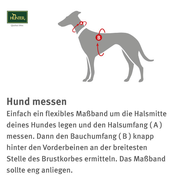 Idealerweise misst du den Bauchumfang des Hundes knapp hinter den Vorderläufen an der breitesten Stelle des Brustkorbes mit einem flexiblen Maßband. Das Maßband sollte eng anliegen, den Hund aber nicht beengen. Etwa eine Fingerbreite Luft sollte zwischen Maßband und Hund bleiben. Anhand dieses Umfangs und der Berücksichtigung des Halsumfangs kann die korrekte Geschirr-Größe ermittelt werden. In der Regel sind alle Geschirre mindestens am Bauch, meist aber auch mehrfach verstellbar und können zugunsten des Tragekomforts optimal an jede Körperform angepasst werden.