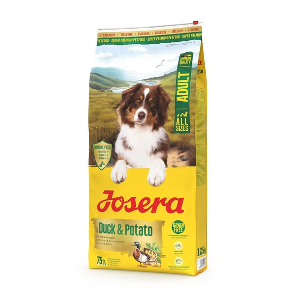 Nur das Beste für unsere Genießer: Josera Duck & Potato ist das beliebte, gut verträgliche Hundefutter mit schmackhafter Ente und Kartoffel für alle Rassen. Die Rezeptur ohne Getreide bringt einen moderaten Energiegehalt für normal aktive Hunde mit. Biotin und wertvolle Fettsäuren unterstützen zudem schöne Haut und glänzendes Fell. Durch die Verarbeitung sorgsam ausgewählter Zutaten ist das getreidefreie Hundefutter besonders gut verträglich und wird super im Napf akzeptiert.