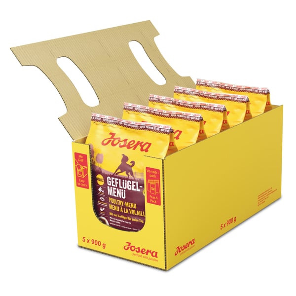 Knackige Kroketten mit ausgesuchten Zutaten und viel Geflügel – und das zu einem unschlagbaren Preis? Mit unserem Josera Geflügel-Menü bringen wir beides in Einklang. Die schmackhafte und leicht verdauliche Mahlzeit wird aber natürlich nicht nur Sie zum Jubeln bringen, sondern auch Ihre Fellnase: Denn neben einer sehr hohen Akzeptanz und guter Verträglichkeit wird sie auch von mäkeligen Hunden sehr gerne gefuttert.