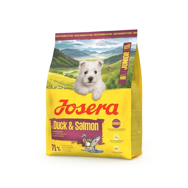 Klein aber oho! Josera Mini Junior Duck & Salmon ist unser spezielles Aufzuchtfutter für kleine Vierbeiner, das eine optimale Entwicklung unterstützt. Dank wertvoller Fettsäuren au dem Lachs unterstützt das Welpenfutter die Gehirnentwicklung. L-Carnitin und hochwertige Proteine fördern eine optimale Entwicklung der Muskulatur. Taurin sowie L-Carnitin sind wichtige Nährstoffe für das Herz.