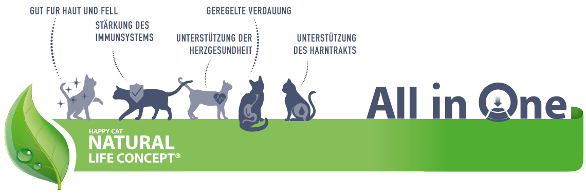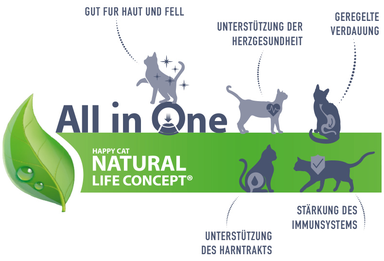 Die schmackhaften Happy Cat Katzenfuttersorten und Rezepturen werden von unseren Ernährungsexperten und Tierärzten mit viel Liebe und Sorgfalt hergestellt. Sie basieren auf dem Happy Cat Natural Life Concept®, das deine Samtpfote gesund und aktiv hält sowie ganzheitlich mit natürlichen Zutaten und allen benötigten Vitalstoffen versorgt: Das Trockenfutter besteht aus hochwertigen Rohstoffen und einem Fleischanteil von bis zu 88 %, verfeinert mit Gemüse, Beeren und Kräutern. Künstliche Farb-, Aroma- oder Konservierungsstoffe sind selbstverständlich nirgends zu finden. Obendrein versorgt die innovative Happy Cat Wirkstoffformel „All in One“ Katzen mit allen wichtigen Nährstoffen. Wertvolle Zutaten halten Herz, Haut und Fell gesund, stärken das Immunsystem, unterstützen eine geregelte Verdauung und den Harntrakt.