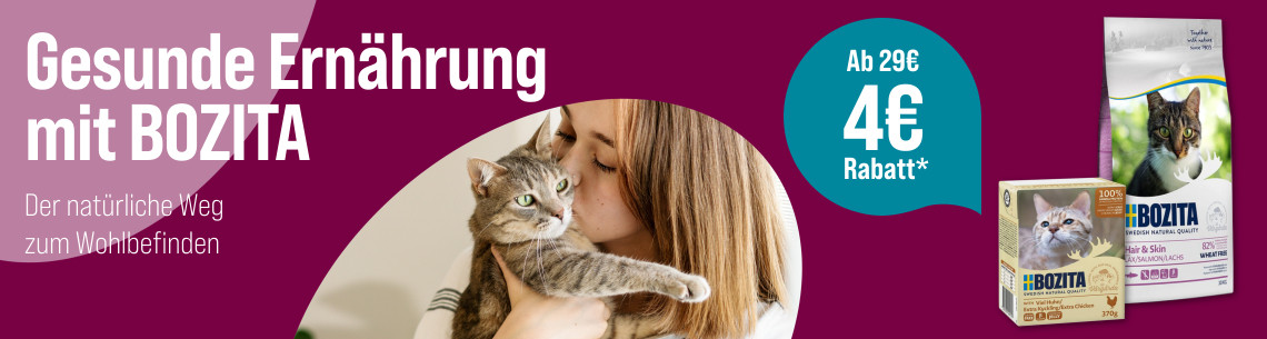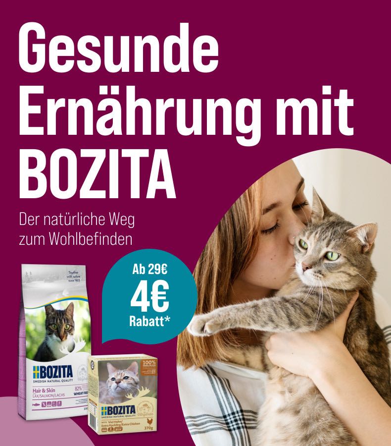*Gültig vom 15.07.2024 bis 11.08.2024. Das Angebot gilt nur auf ausgewählte Produkte auf unserer Aktionsseite. Nur solange der Vorrat reicht. Nur ein Gutscheincode pro Bestellung einlösbar, 4€ Rabatt ab einem Warenkorbwert von 29€ mit dem Gutscheincode Bozita-4. Gilt nur im ZooRoyal Online-Shop und nicht in den ZooRoyal Fachmärkten.