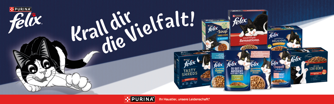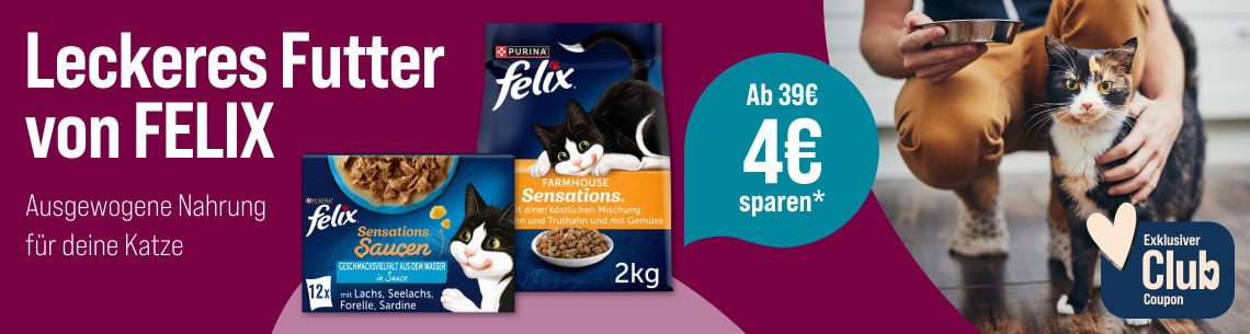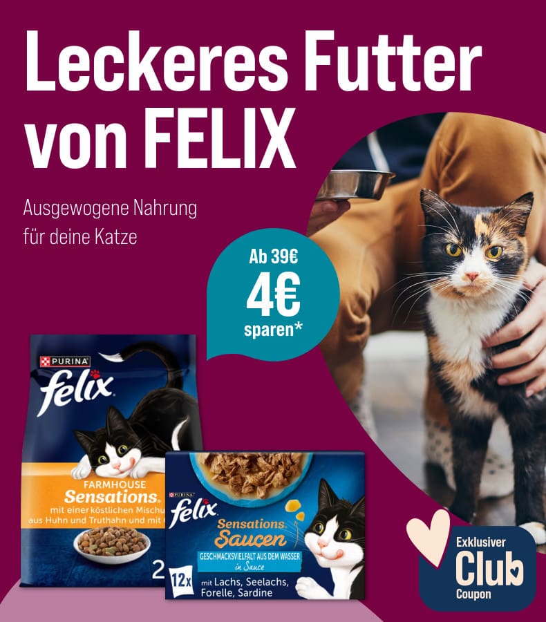 *Gültig vom 16.06.2025 bis 13.07.2025 nur für ZooRoyal Club Mitglieder. 4 € Rabatt ab 39 € auf FELIX Katzenfutter. Gilt nur auf ausgewählte Produkte dieser Aktionsseite. Gilt nur im ZooRoyal Online-Shop und nicht in den ZooRoyal Fachmärkten.
