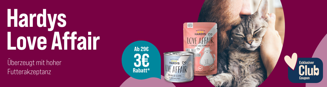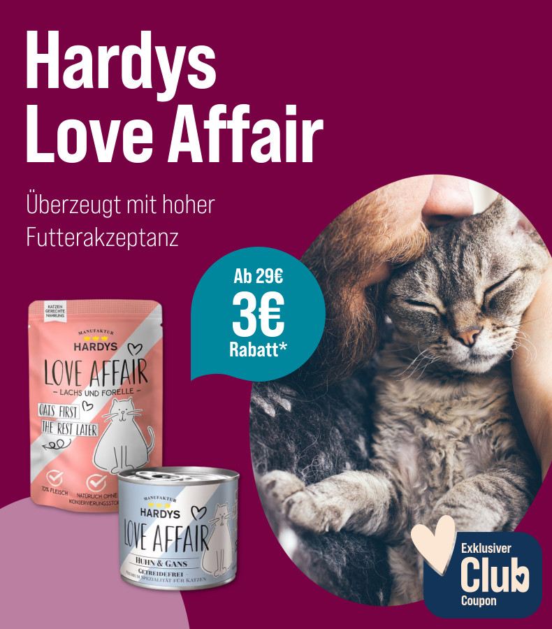 *Gültig vom 21.04.2025 bis 18.05.2025 nur für ZooRoyal Club Mitglieder. Spare 3 € ab 29 € Einkaufswert auf Hardys Katzenfutter. Gilt nur auf ausgewählte Produkte dieser Aktionsseite. Gilt nur im ZooRoyal Online-Shop und nicht in den ZooRoyal Fachmärkten.