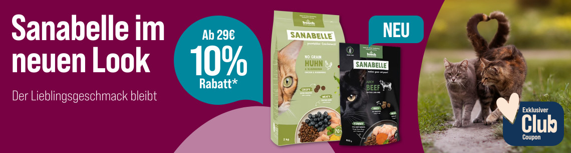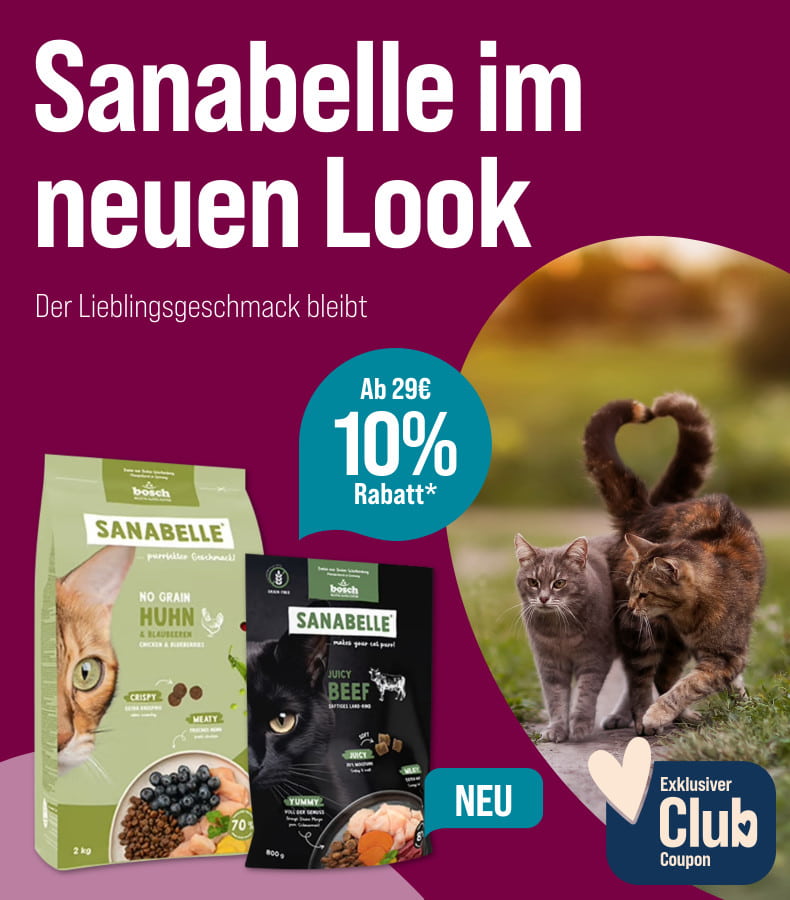 *Gültig vom 11.08.2025 bis 07.09.2025 nur für ZooRoyal Club Mitglieder. Spare 10% ab 29 € auf Sanabelle Futter & Snacks. Gilt nur auf ausgewählte Produkte dieser Aktionsseite. Gilt nur im ZooRoyal Online-Shop und nicht in den ZooRoyal Fachmärkten.