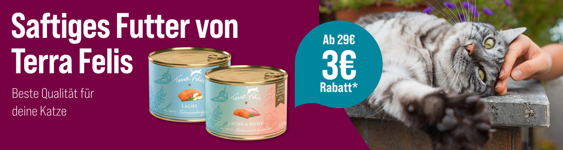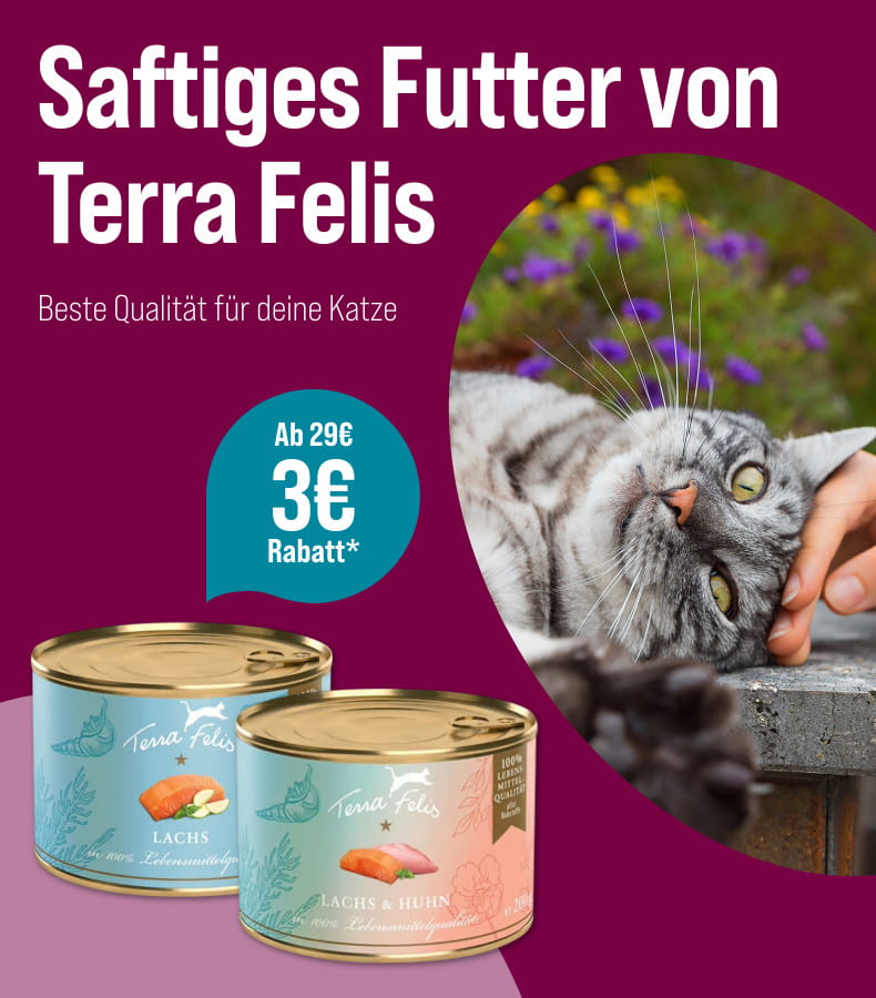 *Gültig vom 08.09.2025 bis 05.10.2025 nur für ZooRoyal Club Mitglieder. Spare 3 € ab 29 € Einkaufswert auf Terra Felis Katzenfutter. Gilt nur auf ausgewählte Produkte dieser Aktionsseite. Gilt nur im ZooRoyal Online-Shop und nicht in den ZooRoyal Fachmärkten.