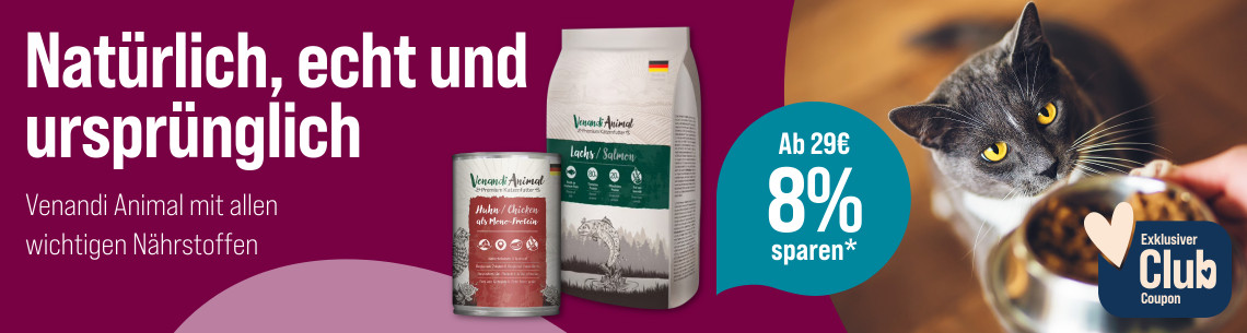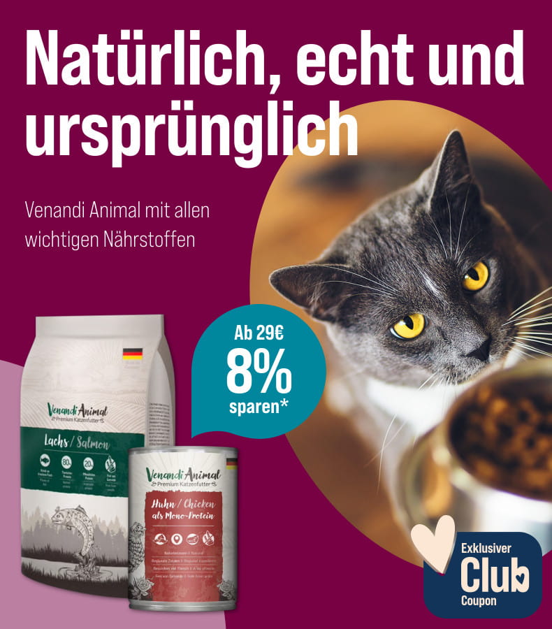 *Gültig vom 03.11.2025 bis 30.11.2025 nur für ZooRoyal Club Mitglieder. Spare 8 % ab 29 € Einkaufswert auf Venandi Animal Katzenfutter. Gilt nur auf ausgewählte Produkte dieser Aktionsseite. Gilt nur im ZooRoyal Online-Shop und nicht in den ZooRoyal Fachmärkten.