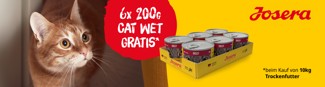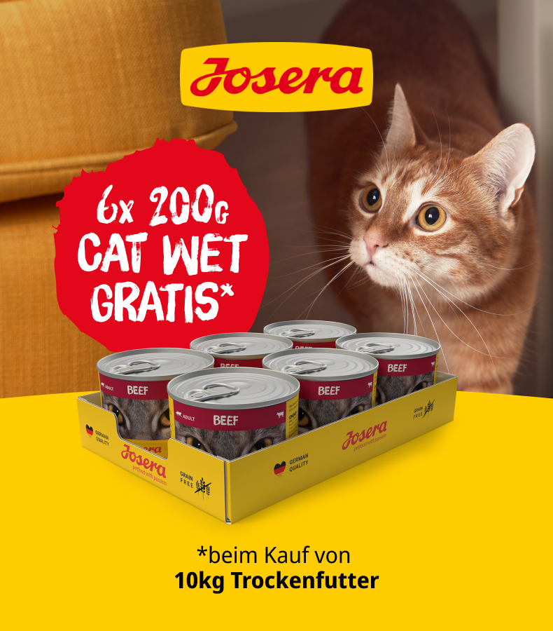 *Gültig vom 09.12.2025 bis 18.12.2025. 6 x 200g CAT WET gratis beim Kauf von 10 kg Trockenfutter mit dem Code Beef-Jos. Das Angebot gilt nur auf ausgewählte Produkte auf unserer Aktionsseite. Nur solange der Vorrat reicht. Nur ein Gutscheincode pro Bestellung einlösbar. Gilt im ZooRoyal Online-Shop und in den ZooRoyal Fachmärkten.