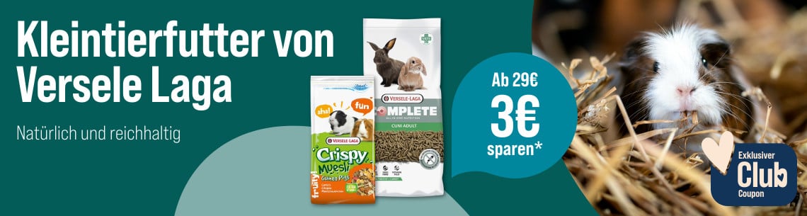 *Gültig vom 01.12.2025 bis 28.12.2025 nur für ZooRoyal Club Mitglieder. Spare 3 € ab 29 € auf Versele Laga Kleintierfutter. Gilt nur auf ausgewählte Produkte dieser Aktionsseite. Gilt nur im ZooRoyal Online-Shop und nicht in den ZooRoyal Fachmärkten.