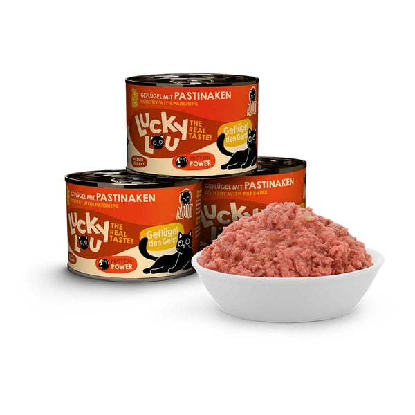 Ihr seht also: Mein Futter gibt es speziell auf unsere verschiedenen Lebensabschnitte und individuellen Bedürfnisse abgestimmt. Langweiligen Einheitsfraß gibt’s woanders – Lucky Lou Lifestage ist in 18 verschiedenen Sorten erhältlich. Damit du deinen Katzen immer frisches Futter servieren kannst, gibt es Lucky Lou Lifestage in Pouchbeuteln mit 125 g Inhalt sowie in Dosen zu 200 g und 400 g. Und Multipacks gibt’s natürlich auch!