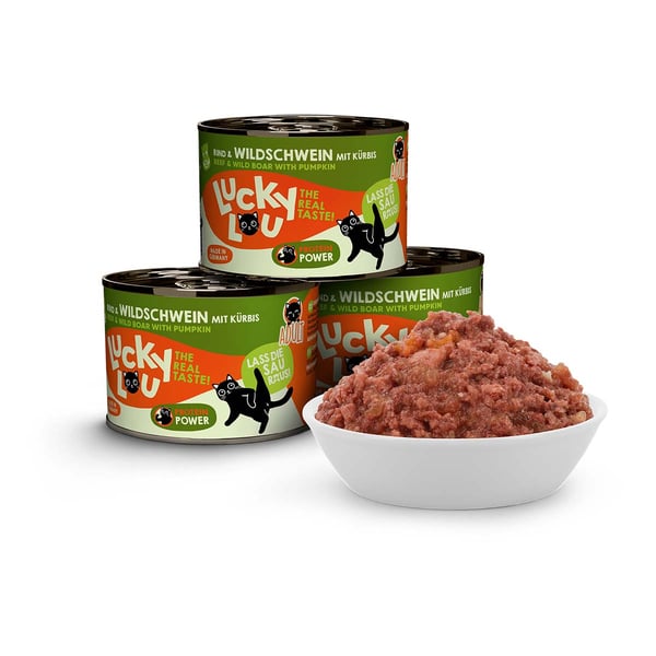 Ihr seht also: Mein Futter gibt es speziell auf unsere verschiedenen Lebensabschnitte und individuellen Bedürfnisse abgestimmt. Langweiligen Einheitsfraß gibt’s woanders – Lucky Lou Lifestage ist in 18 verschiedenen Sorten erhältlich. Damit du deinen Katzen immer frisches Futter servieren kannst, gibt es Lucky Lou Lifestage in Pouchbeuteln mit 125 g Inhalt sowie in Dosen zu 200 g und 400 g. Und Multipacks gibt’s natürlich auch!
