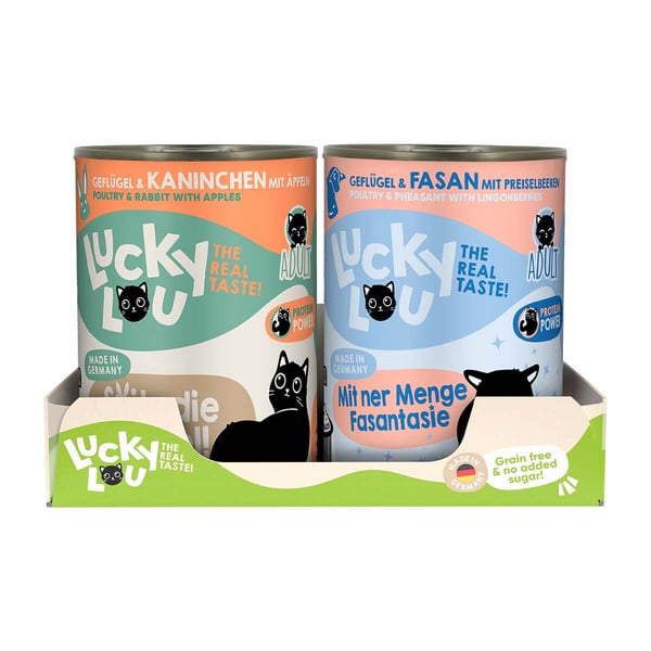 Langweiligen Einheitsfraß gibt’s woanders – Lucky Lou Lifestage ist in 18 verschiedenen Sorten erhältlich. Damit du deinen Katzen immer frisches Futter servieren kannst, gibt es Lucky Lou Lifestage in Pouchbeuteln mit 125 g Inhalt sowie in Dosen zu 200 g und 400 g. Und Multipacks gibt’s natürlich auch!