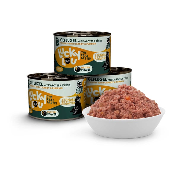 Langweiligen Einheitsfraß gibt’s woanders – Lucky Lou Lifestage ist in 18 verschiedenen Sorten erhältlich. Damit du deinen Katzen immer frisches Futter servieren kannst, gibt es Lucky Lou Lifestage in Pouchbeuteln mit 125 g Inhalt sowie in Dosen zu 200 g und 400 g. Und Multipacks gibt’s natürlich auch!