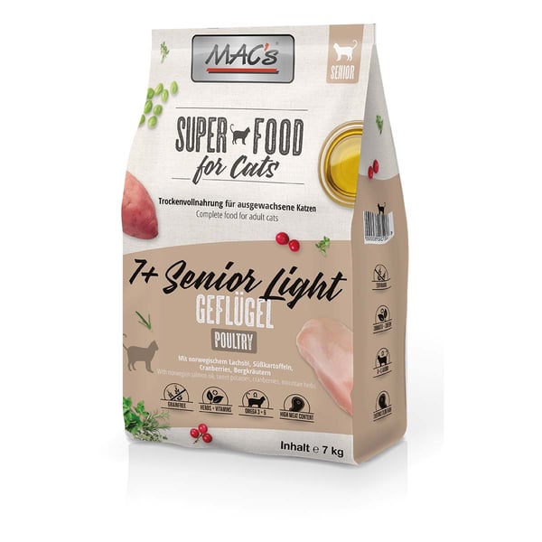 MAC's Cat Senior Light ist eine getreidefreie Vollnahrung und wurde entwickelt, um das Wohlbefinden Ihres Lieblings zu steigern. Protein- und Fettgehalt sind besonders für Indoor-lebende Katzen oder Katzen ab dem 7. Lebensjahr geeignet. Norwegisches Lachsöl sorgt für ein glänzendes Fell. Cranberries können bakteriellen Blaseninfektionen vorbeugen. Neuseeländische Grünlippmuschel liefert natürliches Chondroitin, unterstützt gesunde Gelenke und verbessert die Mobilität. Durch schonende Zubereitung und die Zugabe von Vitaminen und Mineralstoffen wird eine naturnahe Ernährung Ihrer Katze erreicht. Bitte stellen Sie Ihrer Katze jederzeit ausreichend frisches Trinkwasser zur Verfügung.