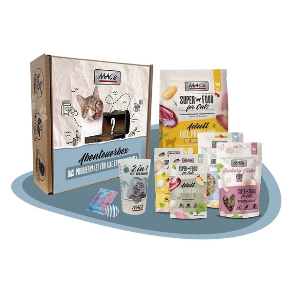 Mit der MAC's CAT Abenteuerbox bietest du deiner Katze eine aufregende Mischung aus Trockenfutter und Snacks. Diese Box ist das ideale Kennenlernpaket für alle Samtpfoten, die gerne Neues ausprobieren. Die abwechslungsreiche Auswahl sorgt für spannende Geschmackserlebnisse und lässt das Herz deiner Katze höherschlagen. Jedes Produkt in der Box wurde sorgfältig ausgewählt, um deiner Katze eine hochwertige Ernährung zu bieten.