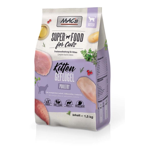 MAC's Kitten Geflügel bietet Ihrer Katze alles, was sie für ein gesundes Wachstum benötigt. Die getreidefreie Vollnahrung wurde entwickelt, um das Wohlbefinden Ihres Lieblings zu steigern. MAC's Kitten bietet ein ausgewogenes Aminosäureprofil. Norwegisches Lachsöl ist reich an Omega-Fettsäuren und sorgt für eine gesunde Haut und ein glänzendes Fell. Cranberries sind natürliche Säurebildner und können bakteriellen Blaseninfektionen vorbeugen. Durch schonende Zubereitung und die Zugabe von Vitaminen und Mineralstoffen wird eine naturnahe Ernährung Ihrer Katze erreicht.