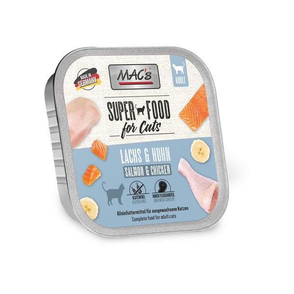 Mit einem hohen Fleischanteil liefert Mac's Cat Lachs & Hühnchen die nötige Energie für den Alltag. Die enthaltenden Aminosäuren unterstützen die Vitalität deiner Katze. Dank der Zugabe von Taurin, einer essentiellen Aminosäure, die Katzen nur begrenzt selbst produzieren können, wird der Bedarf optimal gedeckt. Diese Rezeptur ist ideal für Katzen, die zu Allergien oder Unverträglichkeiten neigen.