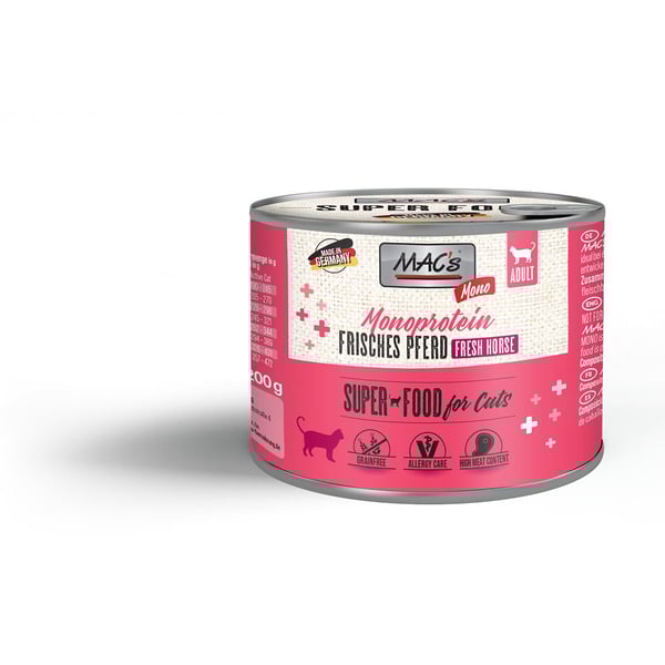 MAC's MONO Pferd besteht aus nur einer Fleischsorte als Proteinlieferant. MAC's MONO eignet sich ideal bei empfindlichen Katzen und ist zur Ausschlussdiät geeignet. Die getreidefreie Vollnahrung wurde entwickelt, um das Wohlbefinden deines Lieblings zu steigern. Durch schonende Zubereitung und die Zugabe von Vitaminen und Mineralstoffen wird eine naturnahe Ernährung deiner Katze erreicht.