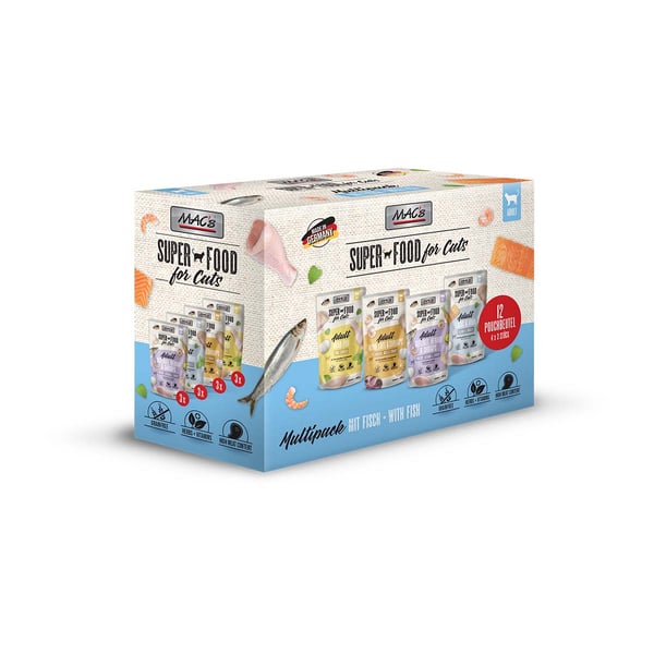 Der MAC's Multipack mit Fisch sorgt für jede Menge Genuss und bietet deiner Katze jede Menge Abwechslung. Enthalten ist Nassfutter in vier delikaten Sorten: Huhn Pur, Huhn & Ente & Shrimps, Geflügel & Hering & Shrimps sowie Lachs & Huhn. Die Katzennahrung wird von vielen Samtpfoten gut akzeptiert und versorgt deine Fellnase mit allen wichtigen Nährstoffen.
