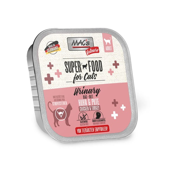 MAC's Cat Vetcare Urinary mit Huhn und Pute ist ein Diät- und Alleinfuttermittel für ausgewachsene Katzen, welches die Auflösung von Struvitsteinen unterstützt.