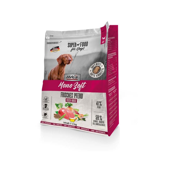 MAC's Dog Mono Soft Frisches Pferd ist getreidefrei und enthält Süßkartoffeln, die die Verdauung deines Hundes unterstützen können. Diese ausgewogene Zusammensetzung macht das Futter ideal für eine Ausschlussdiät und für Hunde mit ernährungssensiblen Bedürfnissen. So kannst du sicher sein, dass dein Hund die nötigen Nährstoffe erhält.