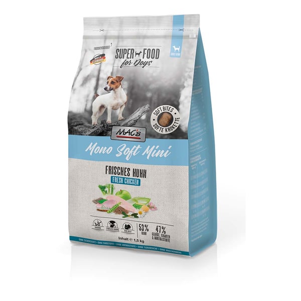 Die vitaminschonende Zubereitung und der hohe Feuchtigkeitsgehalt machen MAC's Dog Mono Soft Mini Frisches Huhn zu einer beliebten Wahl für Hunde, die sich zwischen Trocken- und Nassfutter nicht entscheiden können. Die natürlichen Zutaten und der Verzicht auf Getreide tragen zu einer hohen Akzeptanz bei. Chicorée unterstützt dabei die Verdauung auf natürliche Art.