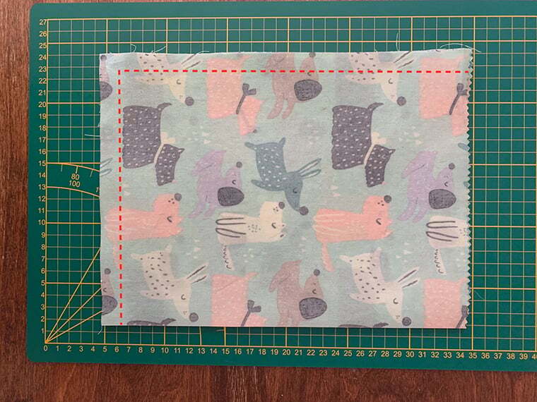 Nimm zuerst das große Rechteck im Querformat, falte es von rechts nach links, während die schöne Stoffseite innen liegt und nähe entlang der gezeigten Markierung.