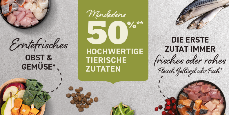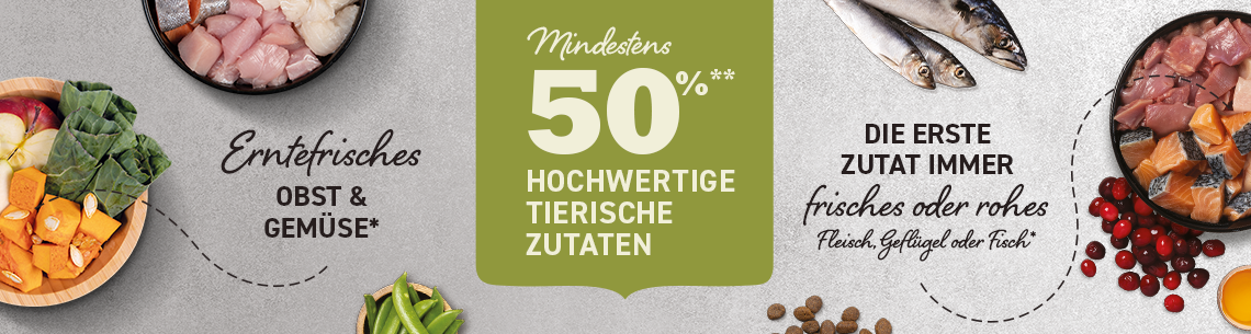 • Mindestens 50 % ** hochwertige tierische Zutaten – für eine proteinreiche, nährstoffreiche Ernährung
