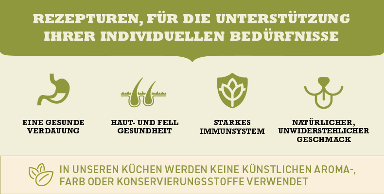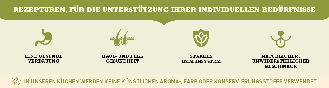 Dank des hohen Anteils an tierischem Eiweiß aus Geflügel, Fleisch und Fisch ausgewogen mit frischen Obst und gemüse ist jede Rezeptur nahrhaft, natürlich und sättigend. Wir verwenden keine Zutaten wie Soja, Mais, Weizen oder Tapioka, sondern setzen auf frische, hochwertige Zutaten.