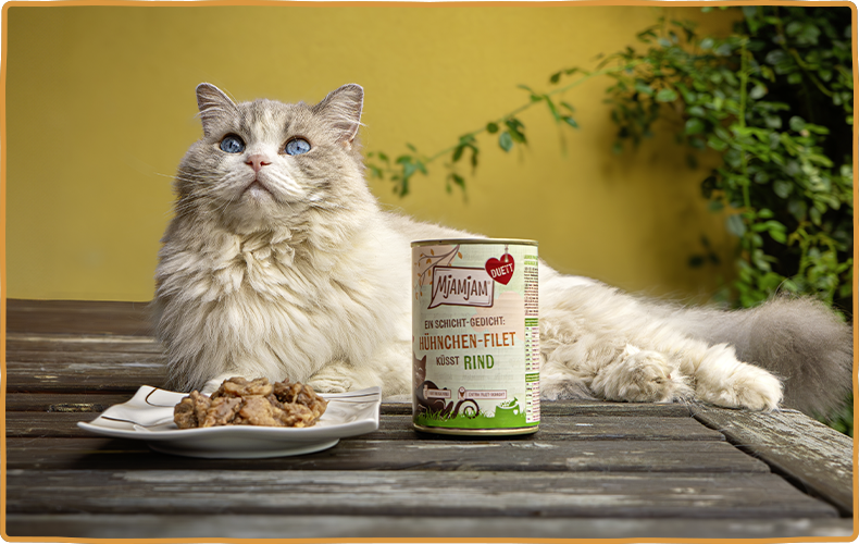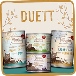 Purer Fleischgenuss garniert mit einer exquisiten Schicht Filetgenuss. Das ist unser traumhaftes Duett. Das Schicht-Gedicht aus der Dose bringt selbst mäkelige Katzen zum Schnurren. Teste jetzt unser Sonntagsessen für Samtpfoten! Was macht Duett so besonders? Unten in der Dose ist eine vollwertige Mahlzeit, wie ihr sie aus „purer Fleischgenuss“ kennt. Der Clou: Obendrauf packen wir eine feine Schicht Filet-Genuss. Heraus kommt ein Mix, der sowohl in Geschmack als auch Konsistenz die Katzen und Geschmäcker von Katzen auf der ganzen Welt erobert. Du hast eine ganz besonders mäkelige Mieze oder möchtest deiner Katze einfach mal einen echten Sonntagsbraten gönnen? Dann ist jetzt die richtige Zeit für MjAMjAM Duett!