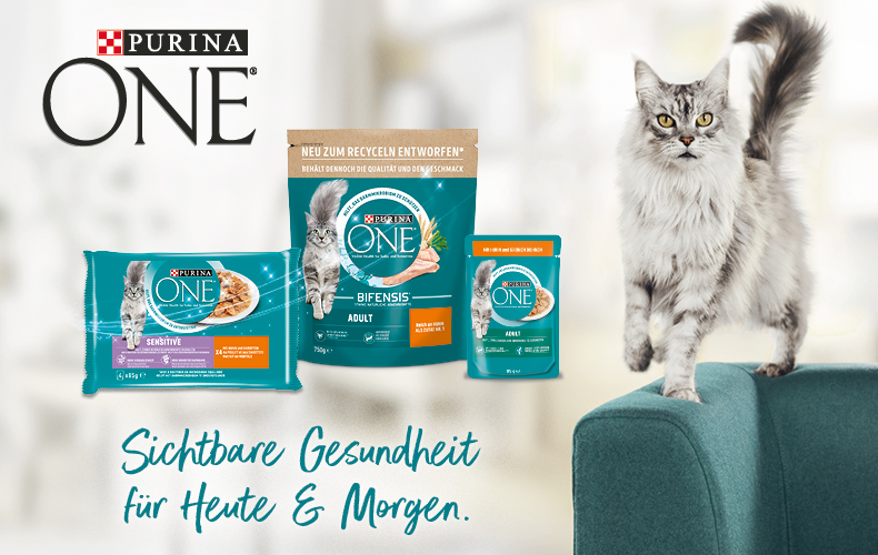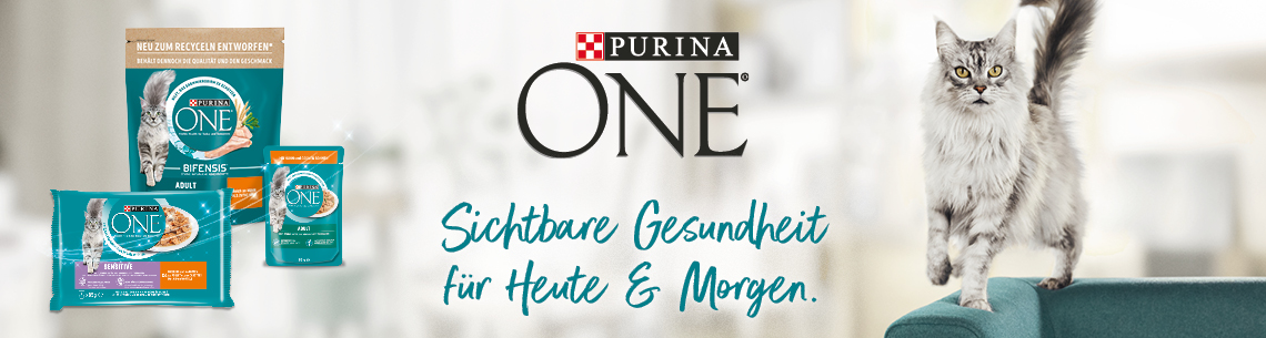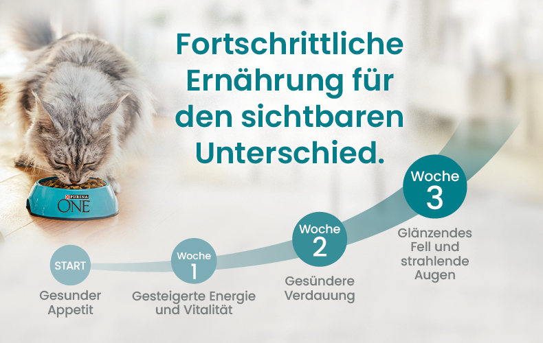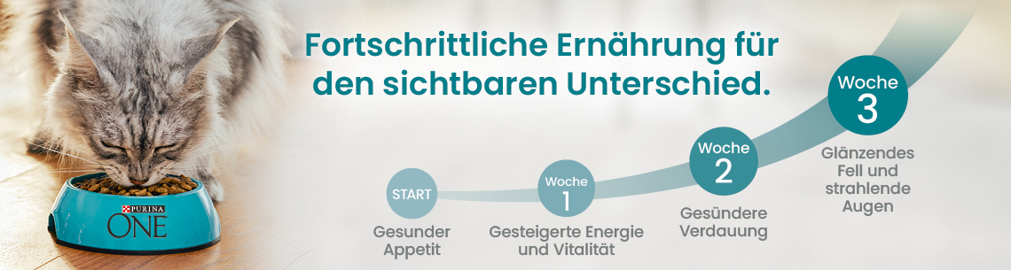 Die fortschrittliche, maßgeschneiderte Ernährung von PURINA ONE® ist von führenden Ernährungsexperten entwickelt und gezielt abgestimmt auf die speziellen Bedürfnisse Ihrer Katze. Mit der innovativen Nass- und Trockennahrung, die durch hochwertige Zutaten und köstlichen Geschmack überzeugt, werden Sie in nur 3 Wochen einen positiven Unterschied im Wohlbefinden Ihrer Katze feststellen. Dazu zählt ein gesunder Appetit, ein gesteigertes Level an Energie und Vitalität und eine gesündere Verdauung. Die ausgewogene und vollwertige Ernährung versorgt Ihre Katze mit allen wichtigen Nährstoffen, die sie braucht. Das erkennen Sie auch an ihrem glänzenden Fell, den strahlenden Augen und langfristig an einem starken Immunsystem.