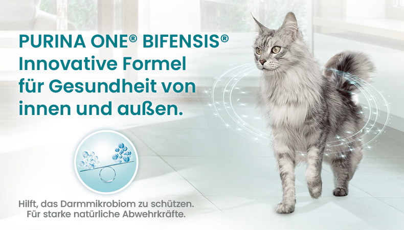 PURINA ONE®BIFENSIS® für Gesundheit von innen und außen: Im Inneren unterstützen wärmebehandelte Milchsäurebakterien und essenzielle Omega-6-Fettsäuren nachweislich die Produktion von Antikörpern und damit das gesunde Immunsystem Ihrer Katze, während sie außen für glänzendes Fell und gesunde Haut sorgen.