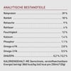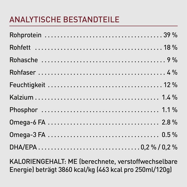 Analytische Bestandteile:Rohprotein: 39%, Rohfett: 18%, Rohasche: 9%, Rohfaser: 4%, Feuchtigkeit: 12%, Kalzium: 1,4%, Phosphor: 1,1%, Magnesium: 0,1%, Omega-6-FA: 2,8%, Omega-3-FA: 0,9%, DHA/EPA: 0,2% / 0,2%