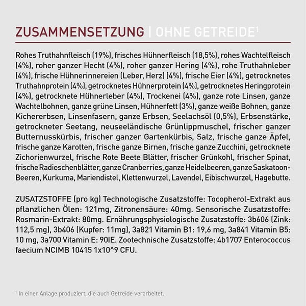 Rohes Truthahnfleisch (19%), frisches Hühnerfleisch (18,5%), rohe Wachtel (4%), roher ganzer Hecht (4%), roher ganzer Hering (4%), rohe Truthahnleber (4%), frische Hühnerinnereien (Leber, Herz) (4%), frische Eier (4%), getrocknetes Hühnerprotein (4%), getrocknetes Truthahnprotein (4%), getrockneter Hering (4%), getrocknete Hühnerleber (4%), frische Eier (4%), ganze rote Linsen, ganze Wachtelbohnen, ganze grüne Linsen, Hühnerfett (3%), ganze weiße Bohnen, ganze Kichererbsen, Linsensamen, ganze Erbsen, Seelachsöl (0,5%), Erbsenstärke, getrockneter Seetang, neuseeländische Grünlippmuscheln, frischer ganzer Butternusskürbis, frische ganze Karotten, frische ganze Birnen, frische ganze Zucchini, getrocknete Zichorienwurzel, frische Rote-Bete-Blätter, frischer Grünkohl, frischer Spinat, frische Radieschenblätter, ganze Cranberries, ganze Heidelbeeren, ganze Saskatoon-Beeren, Kurkuma, Mariendistel, Klettenwurzel, Lavendel, Eibischwurzel, Hagebutte