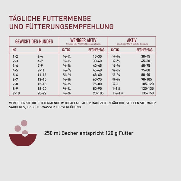 | Gewicht des Hundes | aktive Hunde | weniger aktiver Hunde |