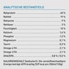 Analytische Bestandteile:Rohprotein: 40 %, Rohfett: 19 %, Rohasche: 9 %, Rohfaser: 3 %, Feuchtigkeit: 10 %, Kalzium: 1,6 %, Phosphor: 1,2 %, Magnesium: 0,1 %, Taurin: 0,3 %, Omega-6-Fettsäuren: 2,1 %, Omega-3-Fettsäuren: 2,1 %, DHA/EPA: 0,8 % / 0,5 %
