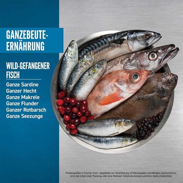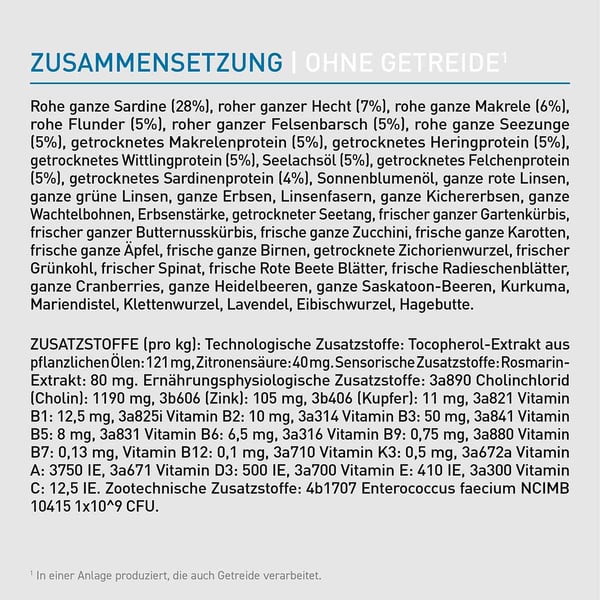 Rohe ganze Sardine (28%), roher ganzer Hecht (7%), rohe ganze Makrele (6%), rohe Flunder (5%), roher ganzer Felsenbarsch (5%), rohe ganze Seezunge (5%), getrocknetes Makrelenprotein (5%), getrocknetes Heringprotein (5%), getrocknetes Wittlingprotein (5%), Seelachsöl (5%), getrocknetes Felchenprotein (5%), getrocknetes Sardinenprotein (4%), Sonnenblumenöl, ganze rote Linsen, ganze grüne Linsen, ganze Erbsen, Linsenfasern, ganze Kichererbsen, ganze Wachtelbohnen, Erbsenstärke, getrockneter Seetang, frischer ganzer Gartenkürbis, frischer ganzer Butternusskürbis, frische ganze Zucchini, frische ganze Karotten, frische ganze Äpfel, frische ganze Birnen, getrocknete Zichorienwurzel, frischer Grünkohl, frischer Spinat, frische Rote Beete Blätter, frische Radieschenblätter, ganze Cranberries, ganze Heidelbeeren, ganze Saskatoon-Beeren, Kurkuma, Mariendistel, Klettenwurzel, Lavendel, Eibischwurzel, Hagebutte