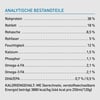 Zusatzstoffe:Technologische Zusatzstoffe: Tocopherol-Extrakt aus pflanzlichen Ölen: 121mg, Zitronensäure: 40mg. Sensorische Zusatzstoffe: Rosmarin-Extrakt: 80mg. Ernährungsphysiologische Zusatzstoffe: 3b606 (Zink: 75mg), 3b406 (Kupfer: 11mg), 3a821 Vitamin B1: 9,8mg, 3a700 Vitamin E: 200 IE. Zootechnische Zusatzstoffe: 4b1707 Enterococcus faecium NCIMB 10415 1x10^9 CFU