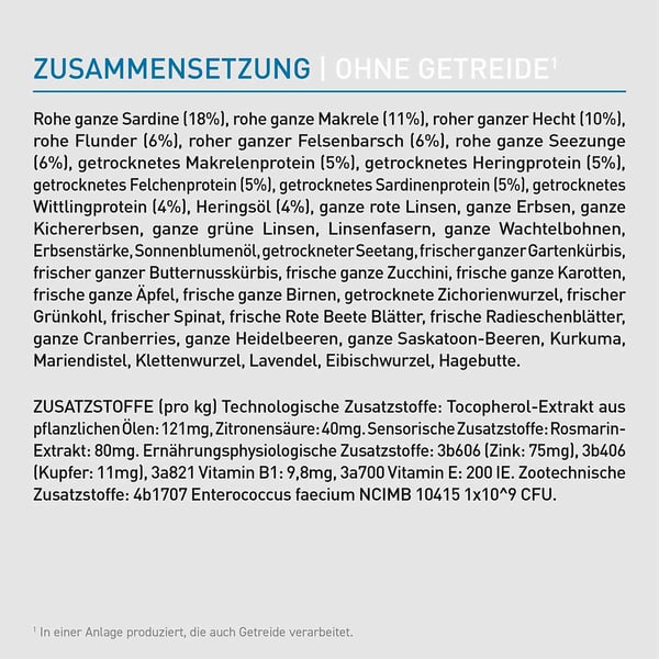 Rohe ganze Sardine (18%), rohe ganze Makrele (11%), roher ganzer Hecht (10%), rohe Flunder (6%), roher ganzer Felsenbarsch (6%), rohe ganze Seezunge (6%), getrocknetes Makrelenprotein (5%), getrocknetes Heringprotein (5%), getrocknetes Felchenprotein (5%), getrocknetes Sardinenprotein (5%), getrocknetes Wittlingprotein (4%), Heringsöl (4%), ganze rote Linsen, ganze Erbsen, ganze Kichererbsen, ganze grüne Linsen, Linsenfasern, ganze Wachtelbohnen, Erbsenstärke, Sonnenblumenöl, getrockneter Seetang, frischer ganzer Gartenkürbis, frischer ganzer Butternusskürbis, frische ganze Zucchini, frische ganze Karotten, frische ganze Äpfel, frische ganze Birnen, getrocknete Zichorienwurzel, frischer Grünkohl, frischer Spinat, frische Rote Beete Blätter, frische Radieschenblätter, ganze Cranberries, ganze Heidelbeeren, ganze Saskatoon-Beeren, Kurkuma, Mariendistel, Klettenwurzel, Lavendel, Eibischwurzel, Hagebutte