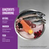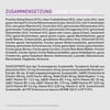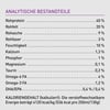 Zusatzstoffe:Technologische Zusatzstoffe: Tocopherol-Extrakt aus pflanzlichen Ölen: 121 mg, Zitronensäure: 40 mg. Sensorische Zusatzstoffe: Rosmarin-Extrakt: 80 mg. Ernährungsphysiologische Zusatzstoffe: 3a890 Cholinchlorid (Cholin): 500 mg, 3a370 Taurin: 400 mg, 3b606 (Zink): 80 mg, 3b405 (Kupfer): 11 mg, 3a821 Vitamin B1: 12,5 mg, 3a825 Vitamin B2: 5 mg, 3a314 Vitamin B3: 25 mg, 3a841 Vitamin B5: 4 mg, 3a831 Vitamin B6: 3,75 mg, 3a880 Vitamin B7: 0,03 mg, 3a316 Vitamin B9: 0,4 mg, Vitamin B12: 0,05 mg, Vitamin E: 60 IE. Zootechnische Zusatzstoffe: 4b1707 Enterococcus faecium NCIMB 10415 1x109 CFU